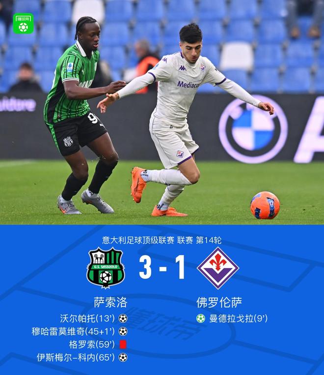 北京时间12月6日22:00,意甲第14轮,萨索洛主场对阵佛罗伦萨。上半场,曼德拉戈拉点射破门,随后沃尔帕托、穆哈雷莫维奇先后得分帮助萨索洛反超;下半场,主教练格罗索不满判罚被红牌罚下,伊斯梅尔-科内破门得分。最终萨索洛3-1逆转佛罗伦萨。